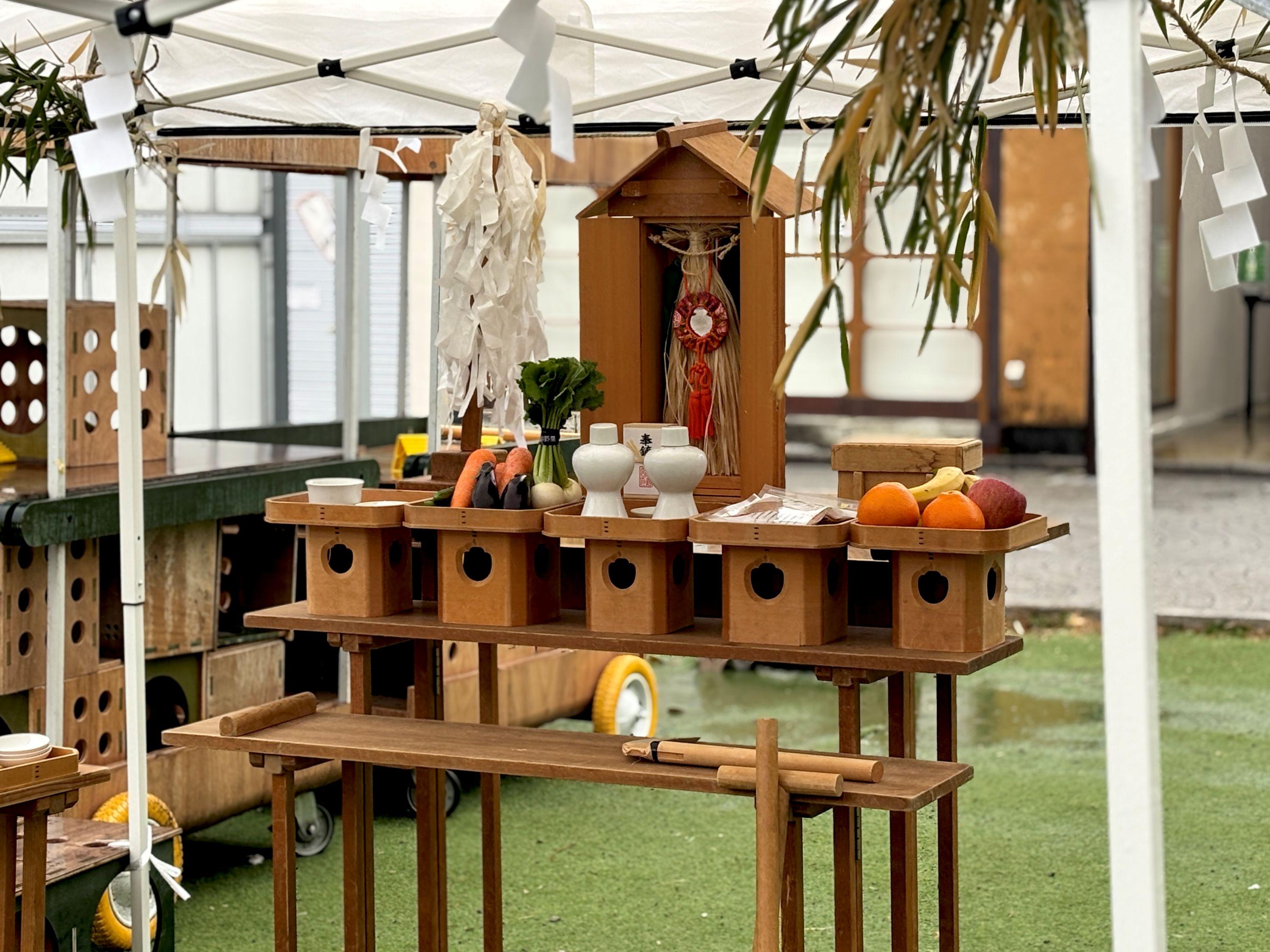 10か月ほど開放していた建築予定地。これまで活躍してきた椅子やテーブル、屋台の什器に見守られながら、地鎮祭を執り行いました。