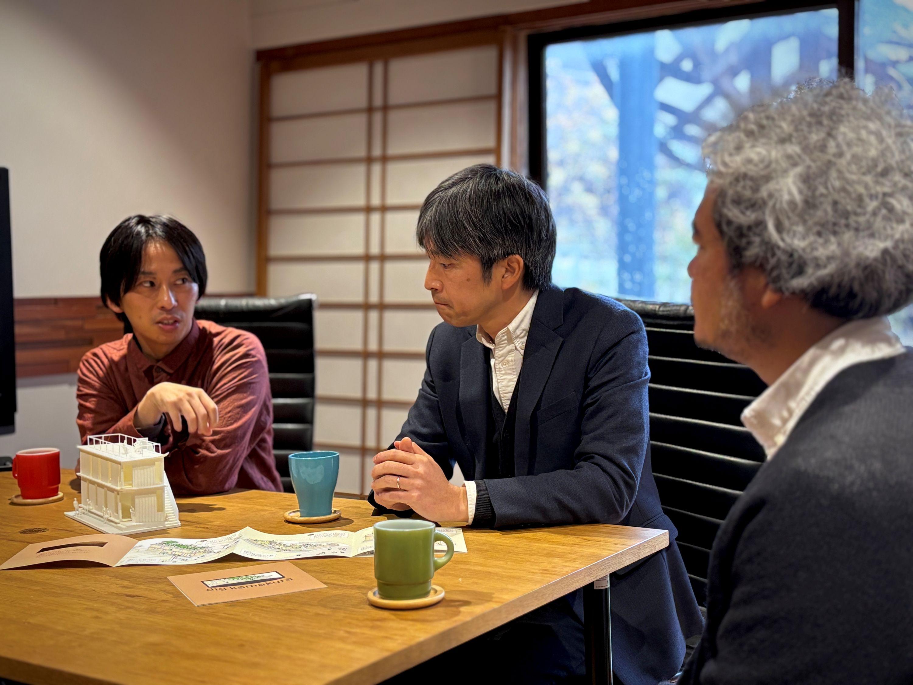 地鎮祭の後に、設計をお願いしているVUILD株式会社の代表の秋吉さんと、わたしたち鎌倉R不動産の代表の野津、ディレクターの小松の3名で、dig kamakuraの建築プロジェクトのことを中心に、対談をしました。その内容は、また改めてコラムにして公開いたします。
