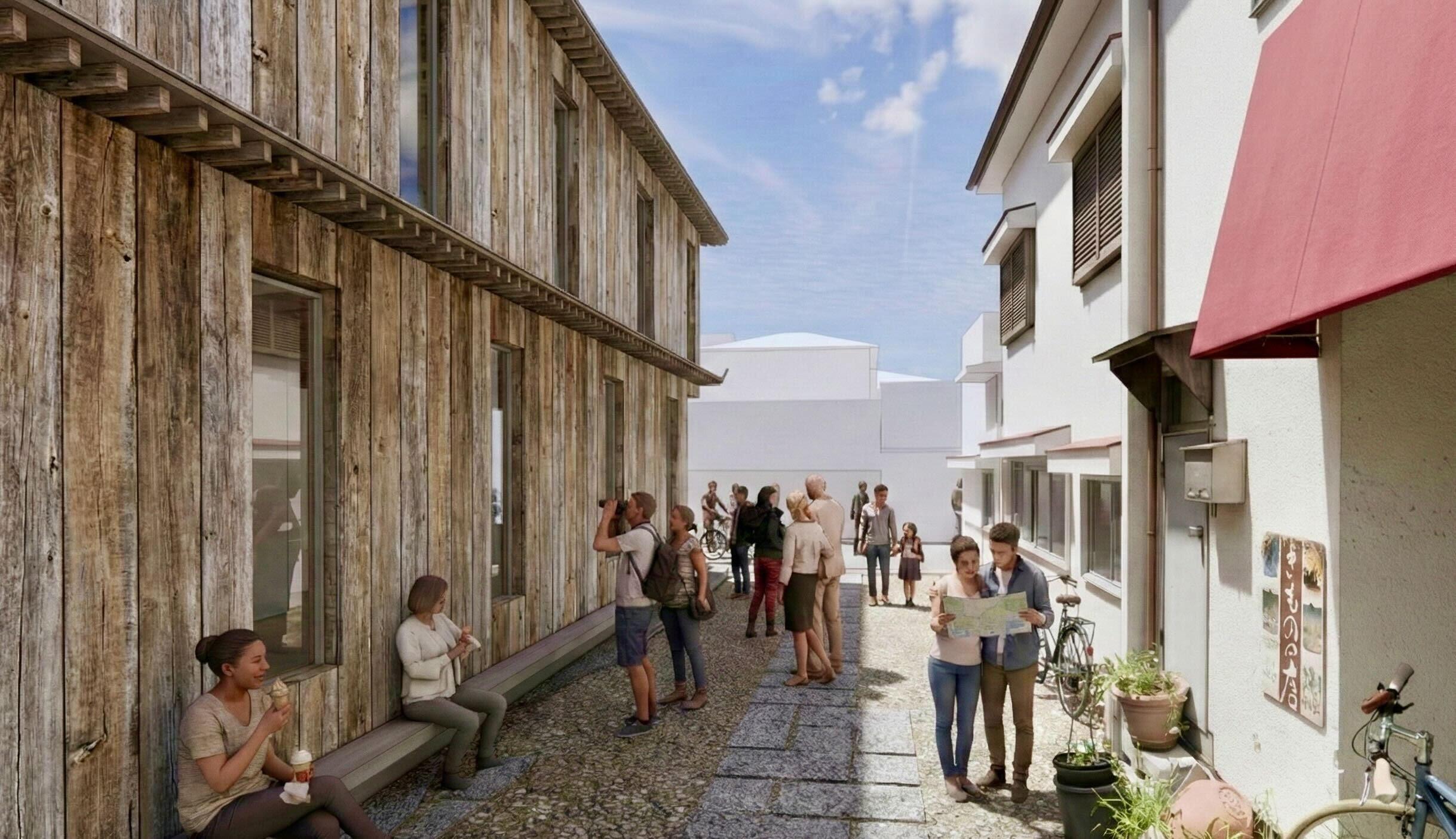 建物は外壁に古材を使用。「塗りフェス」を開催して、たくさんの人に古材の塗装に参加いただいてます。クラファンも含めてみんなで作るdig kamakuraです。(パース提供:VUILD株式会社)